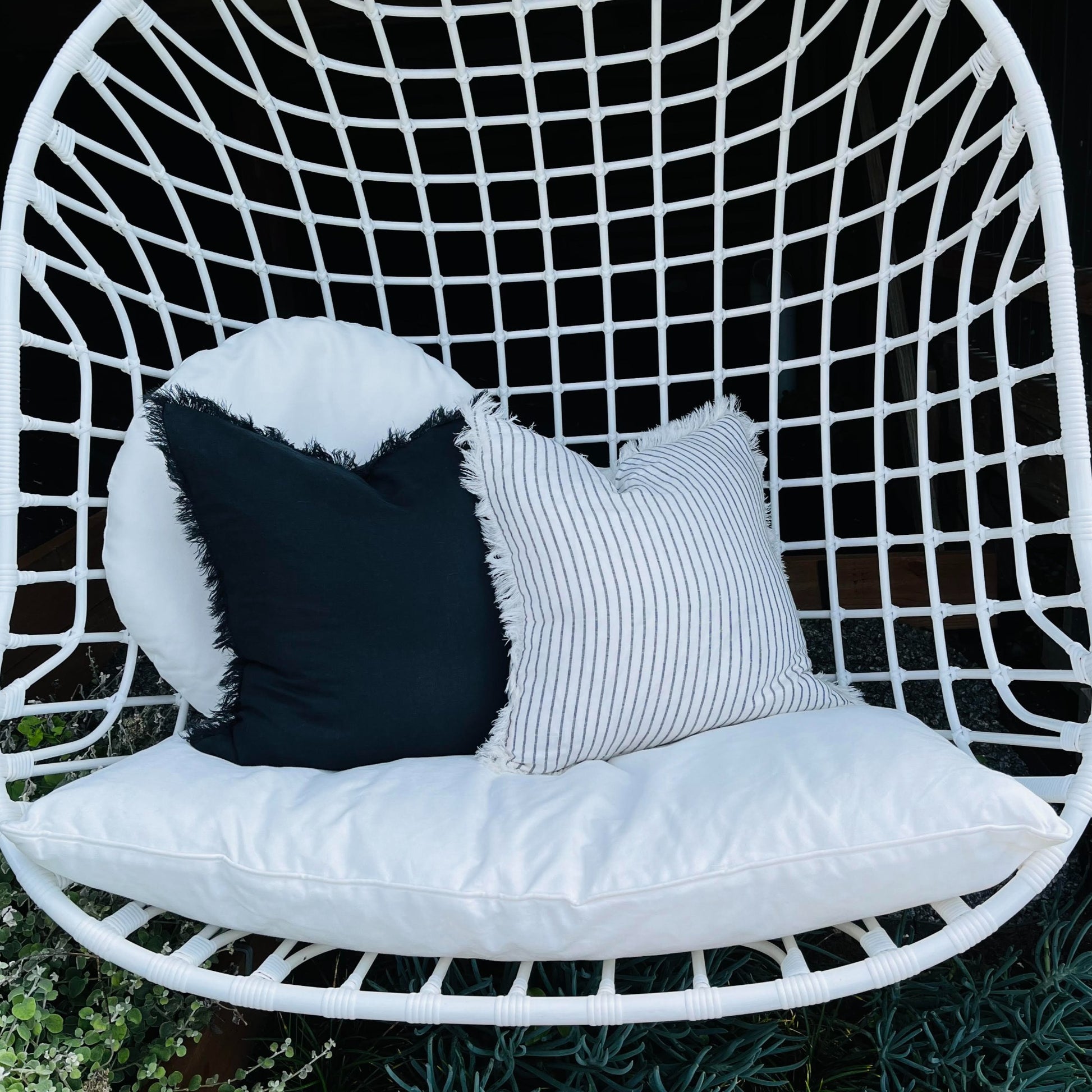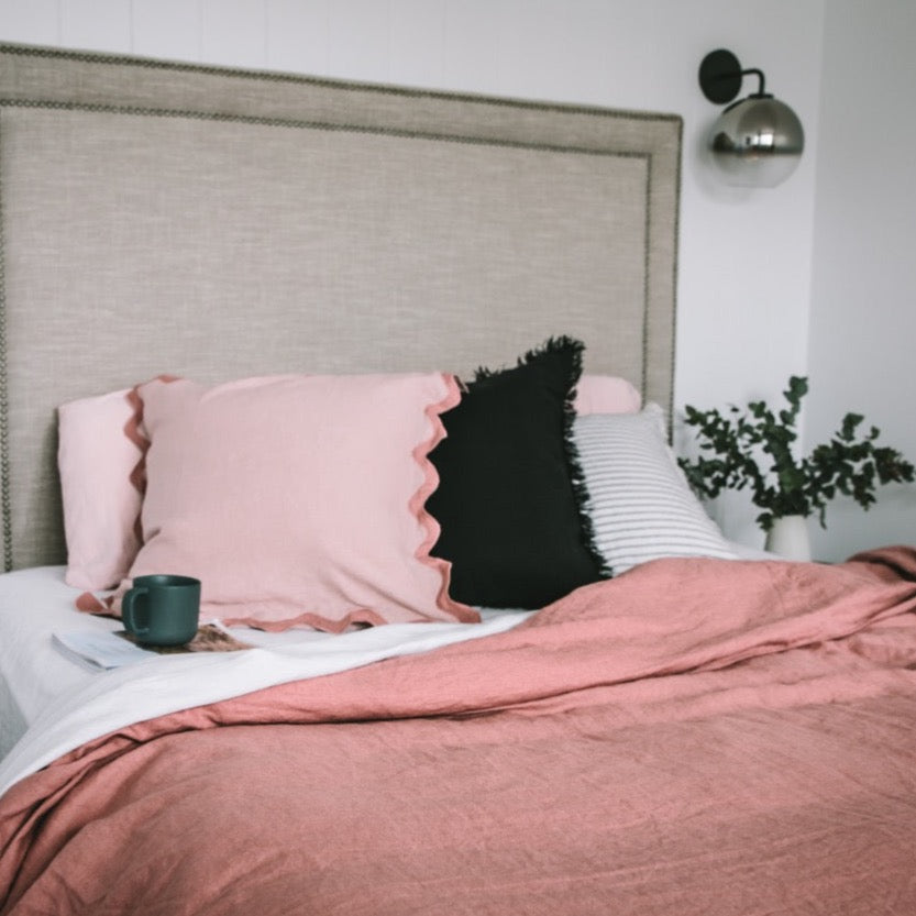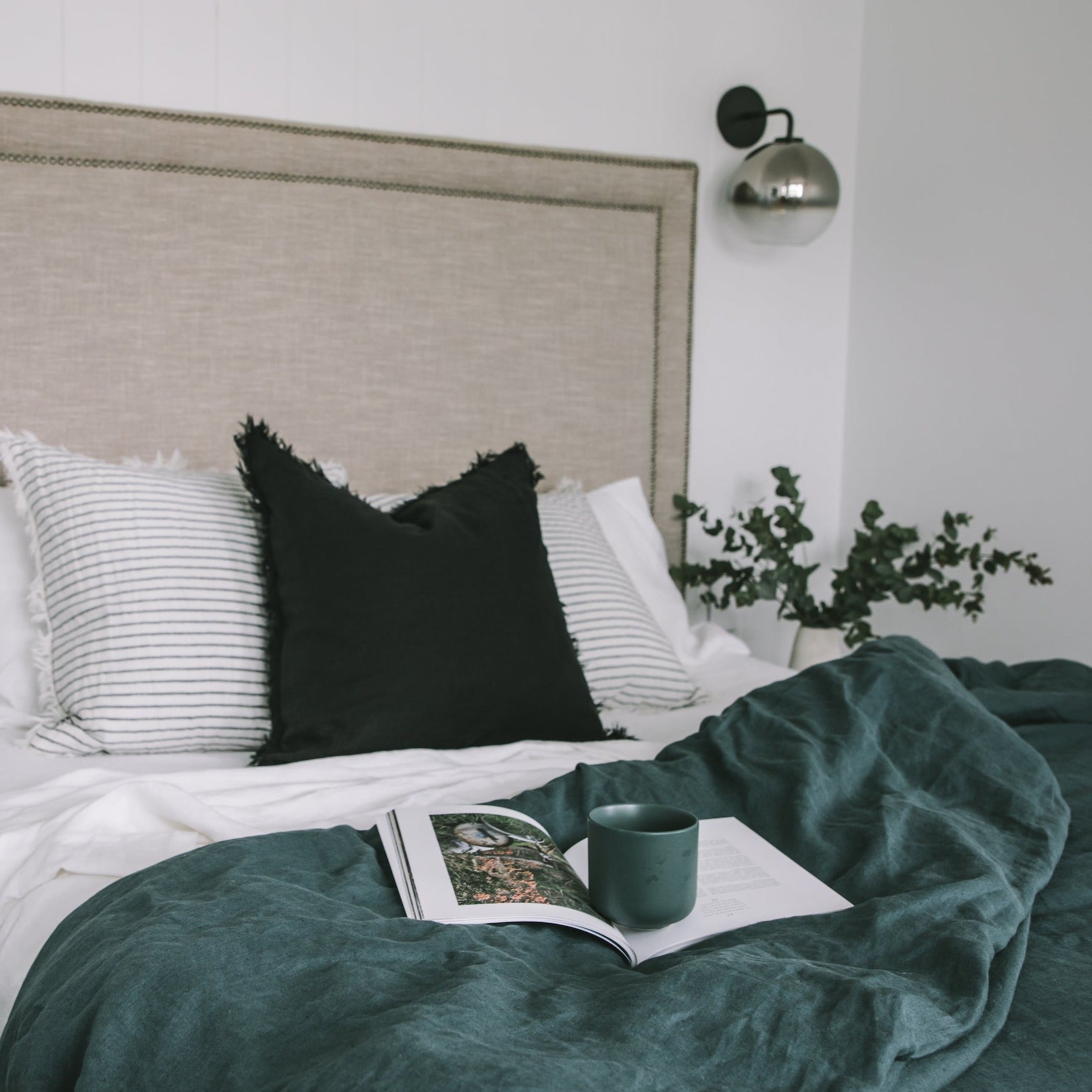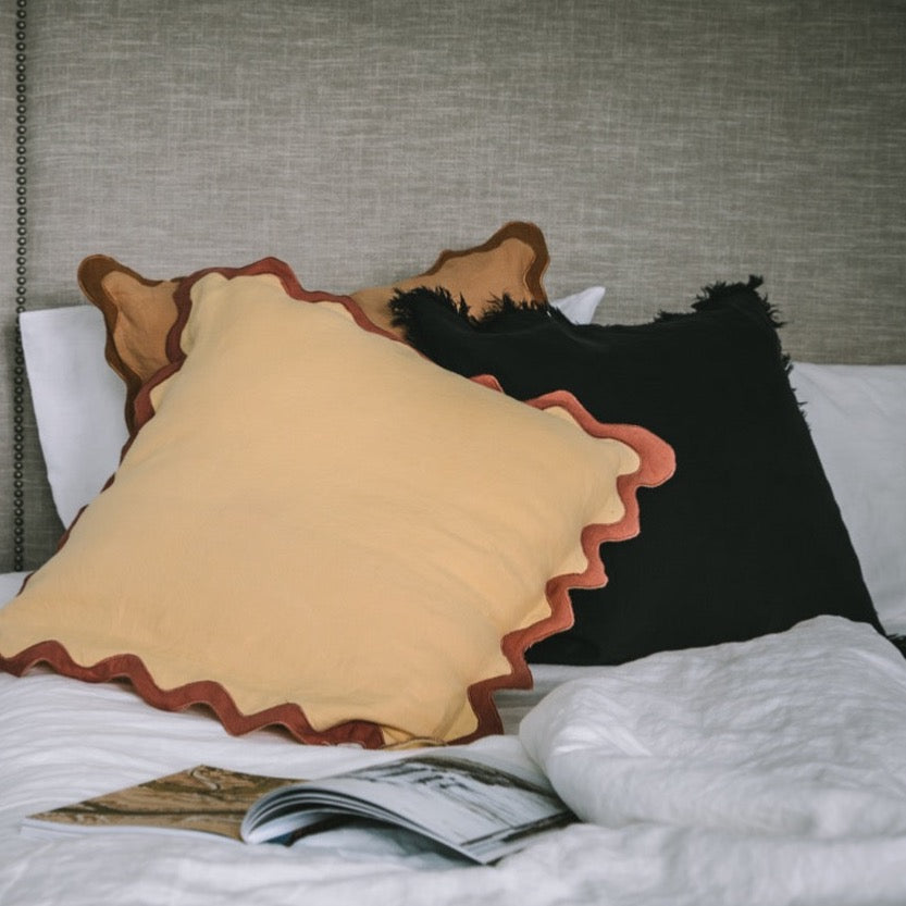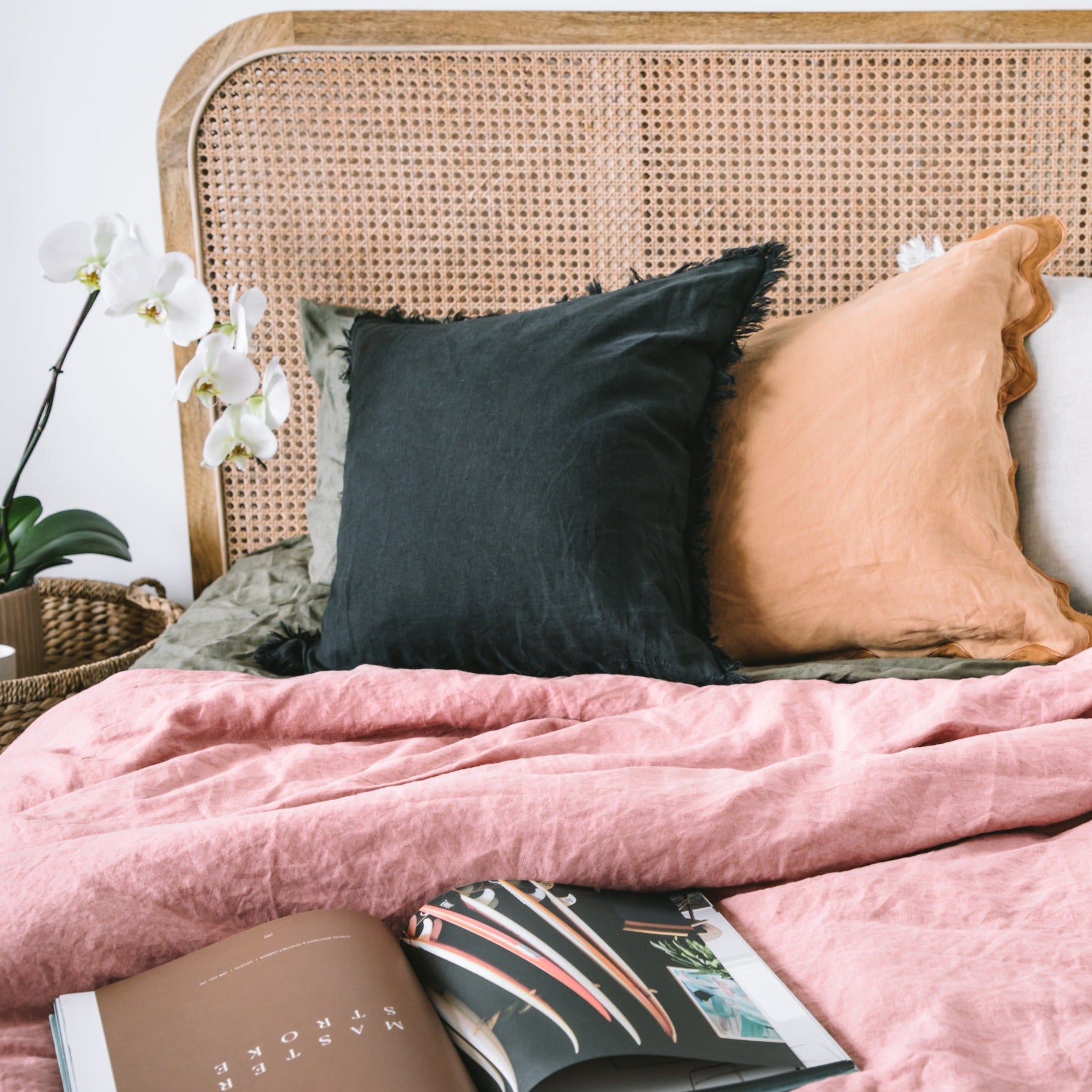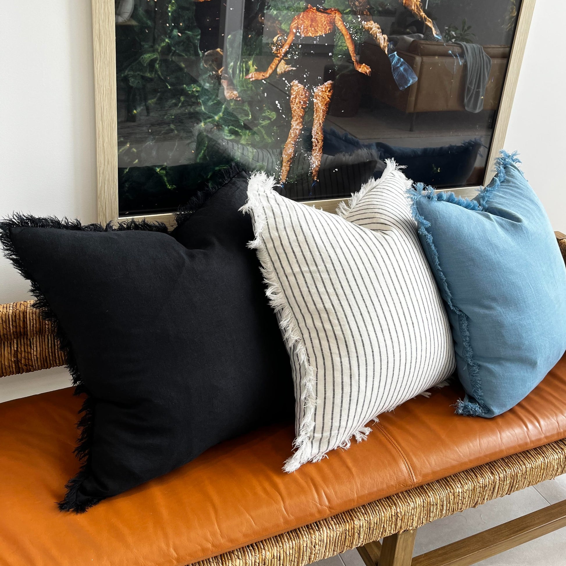 The black linen cushion cover is best styled with the Lurline Co. olive green sheet set, dusty rose duvet, our burnt orange wave cushion and our white linen cushion. It also pairs well with the white linen sheet set, teal duvet cover, blush wave cushion and coastal stripe cushion.