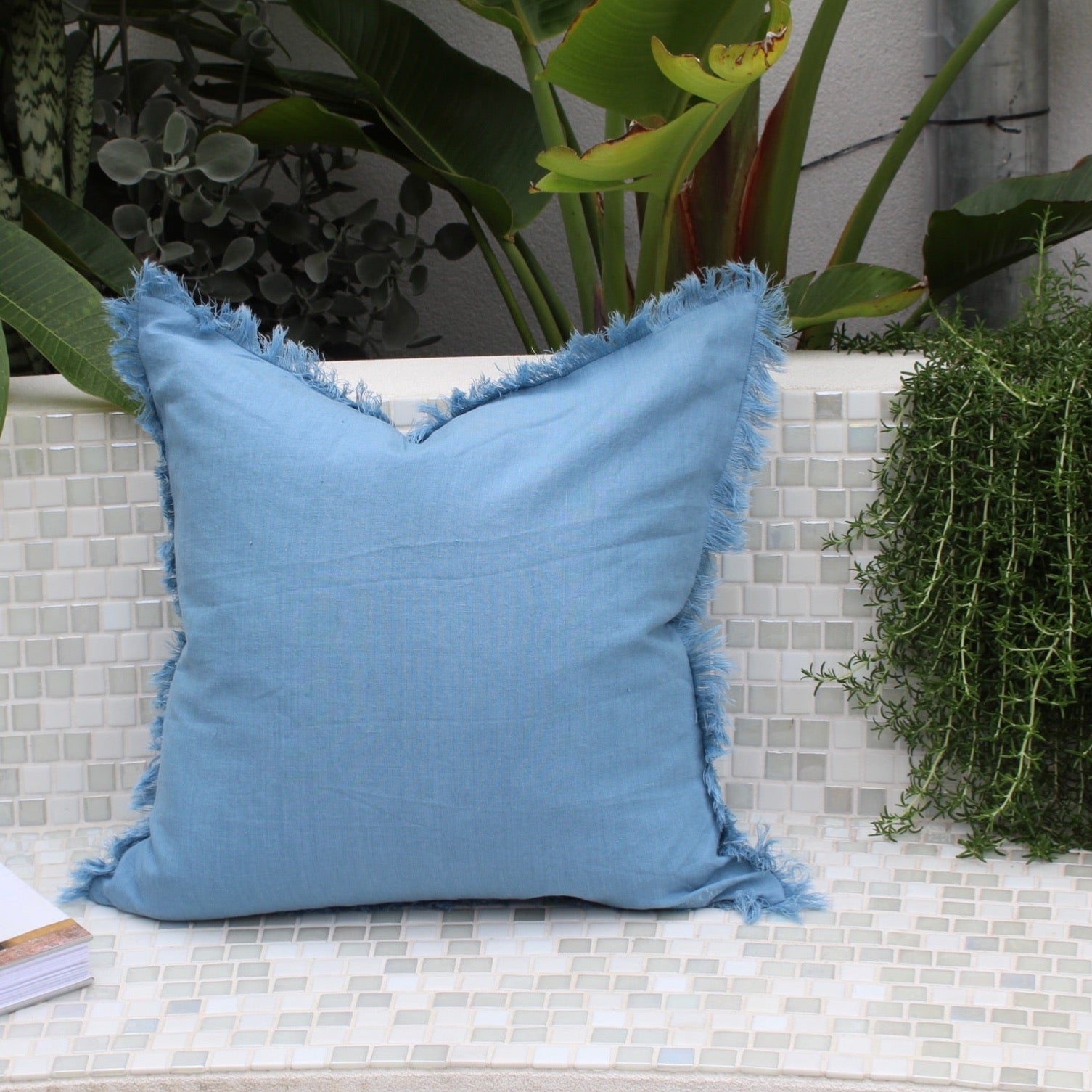 Crafted from 100% flax linen, this cushion cover boasts a gorgeous blue hue and delicate fringe accents, perfectly complemented by a hidden zipper.