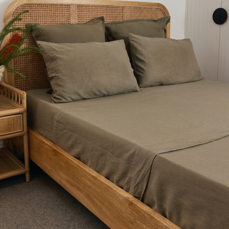 Pair the Olive Green Bed Sheets with the Lurline Co. Sandstone duvet cover and either the natural or white linen cushion covers.