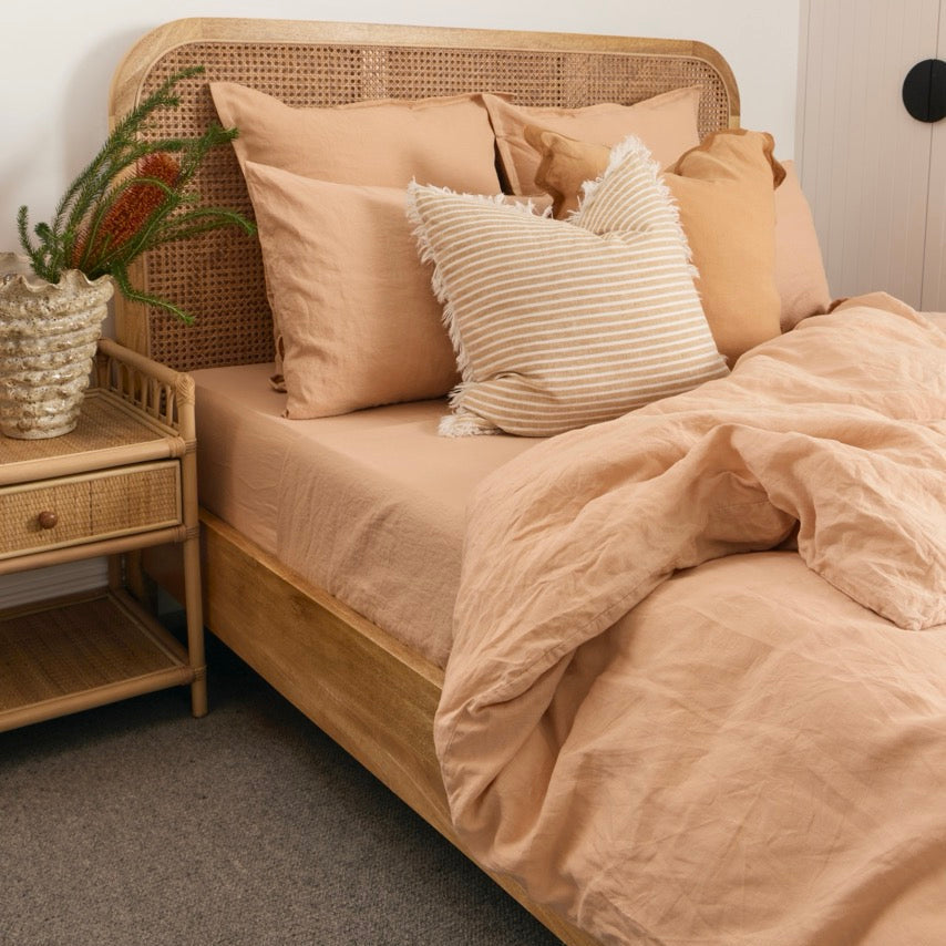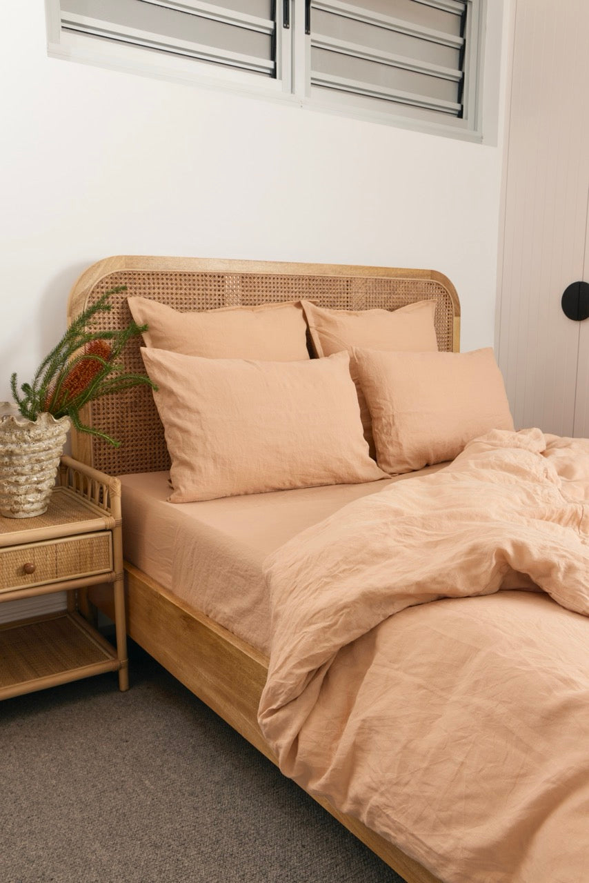 We love the Peach Sheet Set with the Lurline Co. sandstone pillow cases and blush duvet cover.