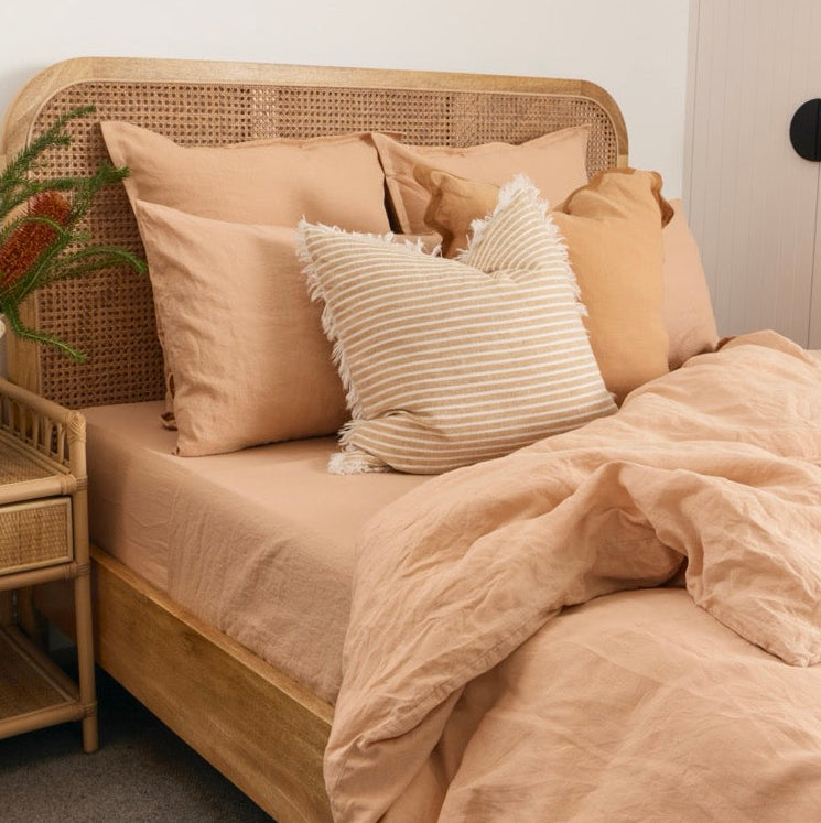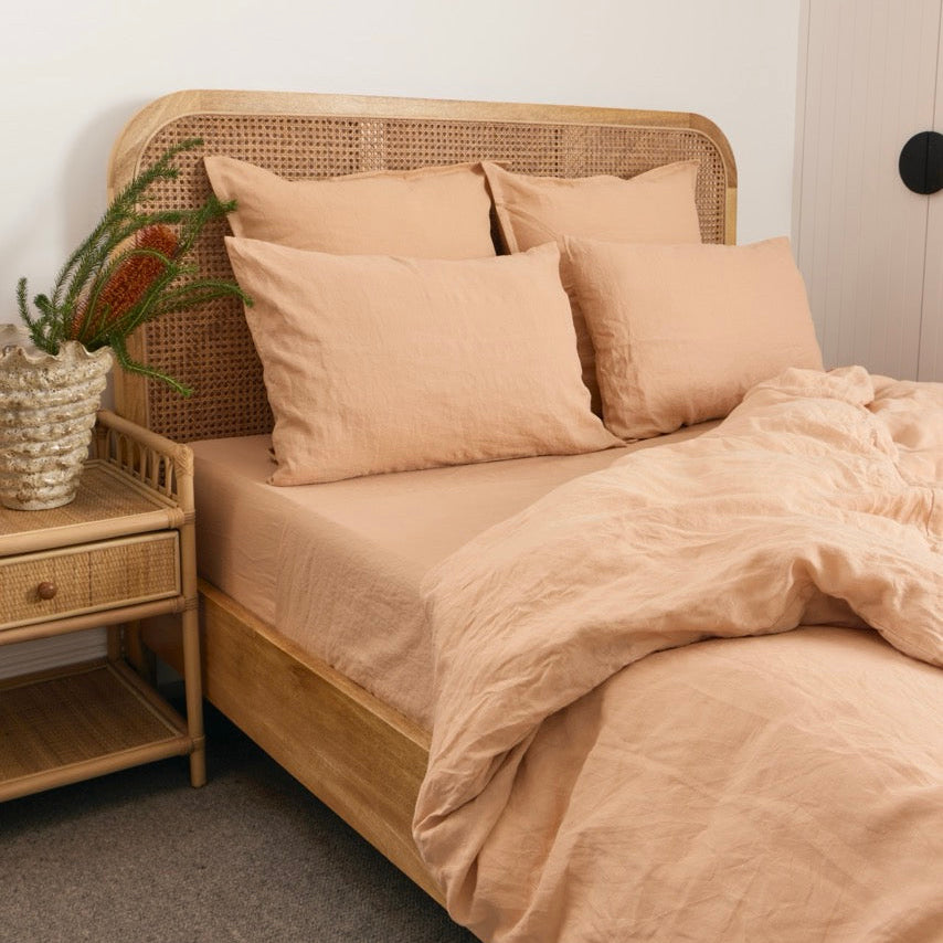 We love the Peach Sheet Set with the Lurline Co. sandstone pillow cases and blush duvet cover.