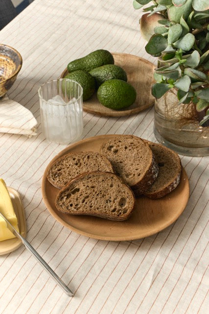 Expertly crafted from 100% European flax linen, the Lurline Co. sandstone tablecloth is the perfect addition to your dining table set up. Add a sense of relaxed luxury to your lunch or dinner set up. The tan and white striped table cloth comes in a beautiful linen bag.
