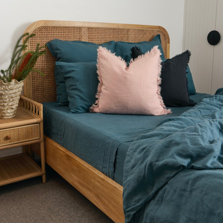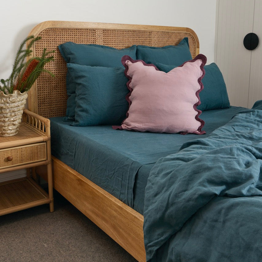 We love the teal sheet set paired with the Lurline Co. purple wave cushion and dusty pink duvet cover.