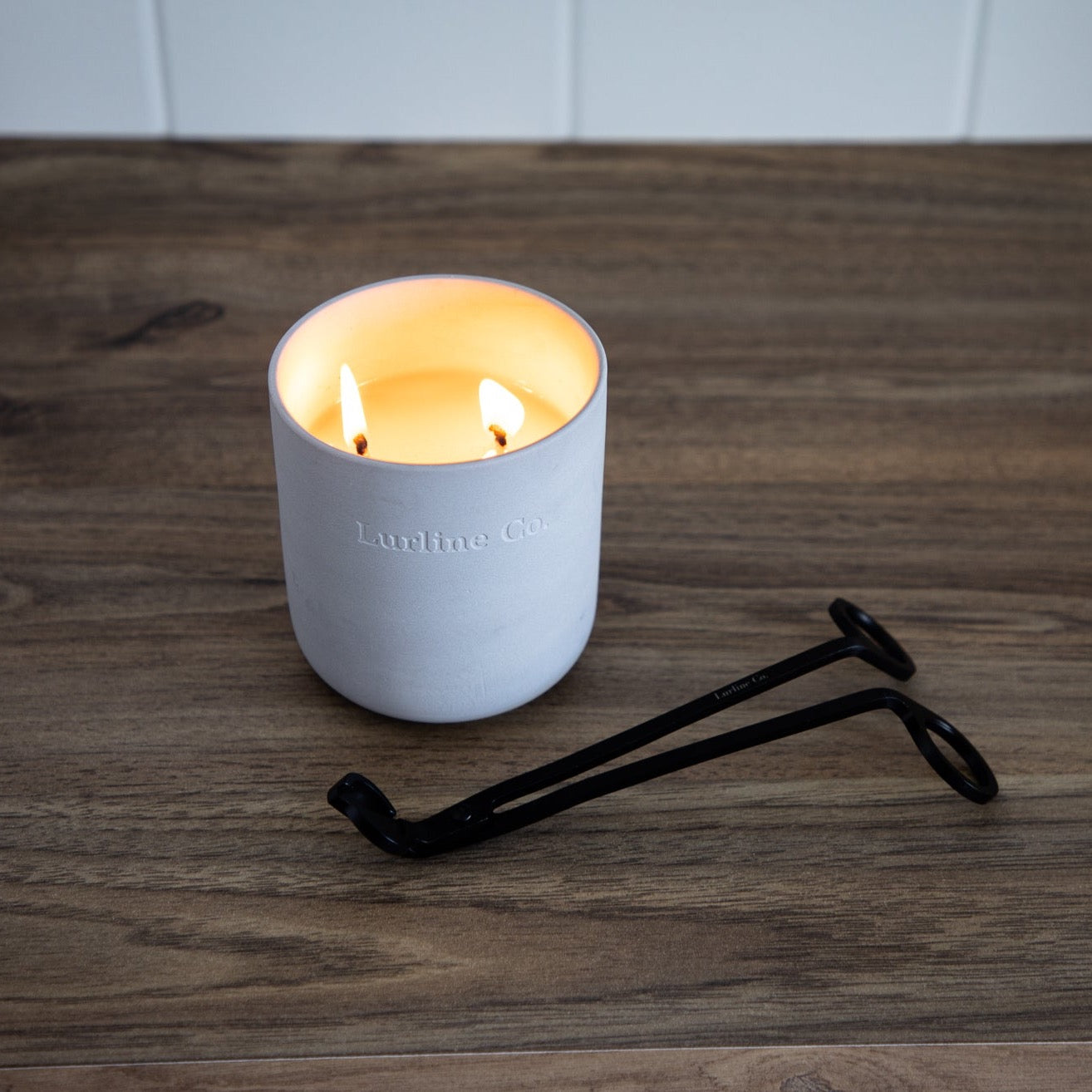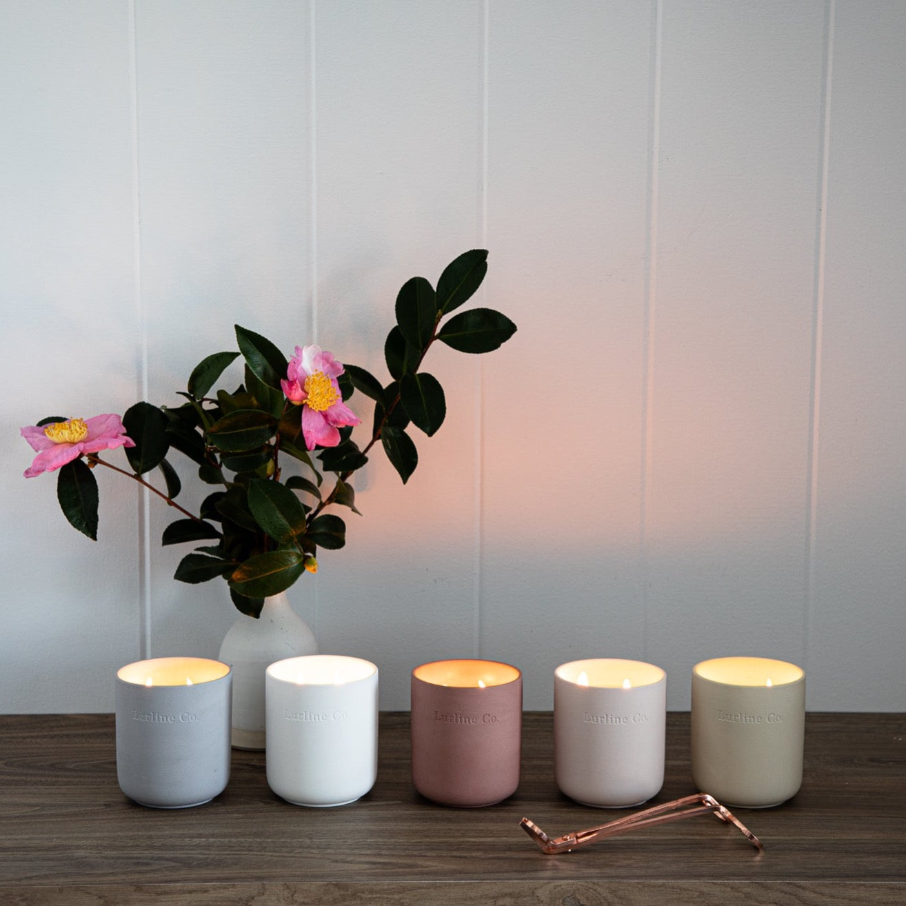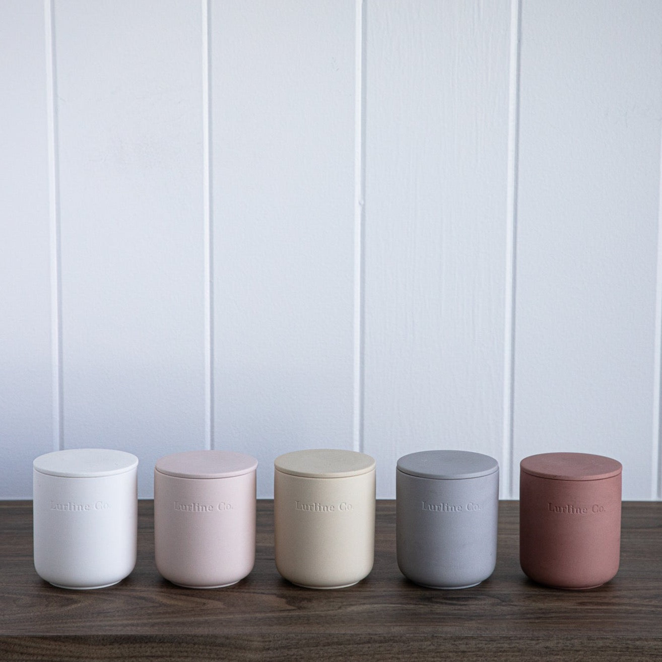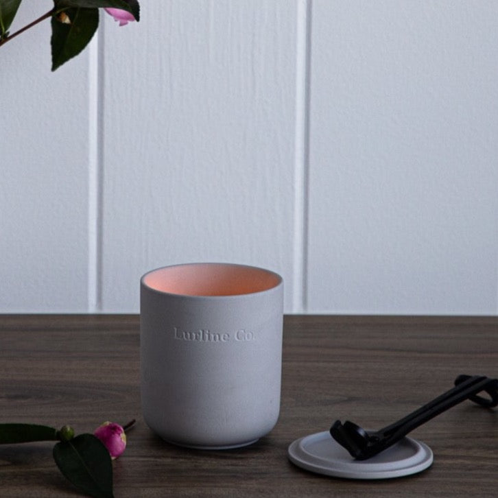 Lurline Co Vanilla Candle comes in a light grey ceramic vessel.