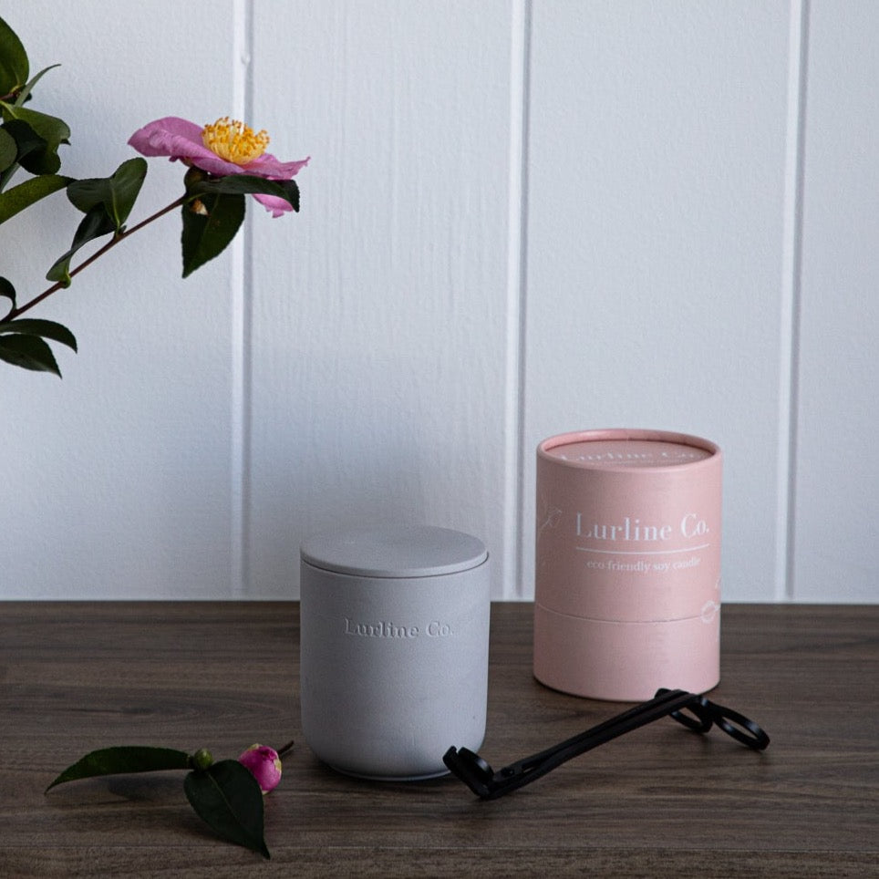 Lurline Co packaging considers the environment: The candle comes in a paper tube which uses recyclable paper content and is plastic-free.