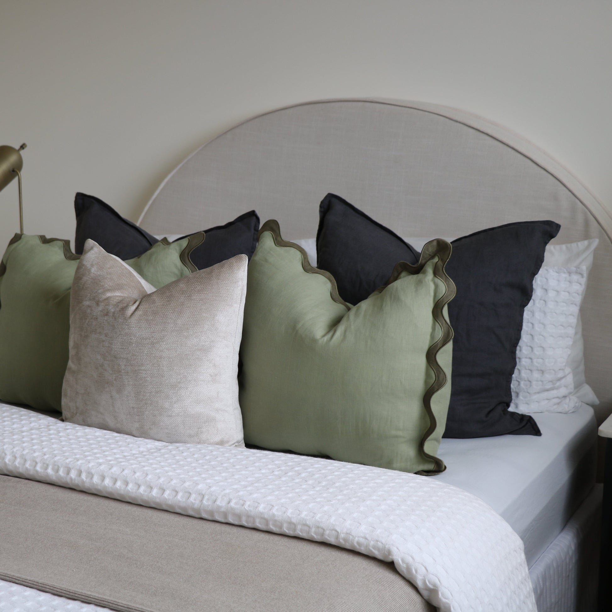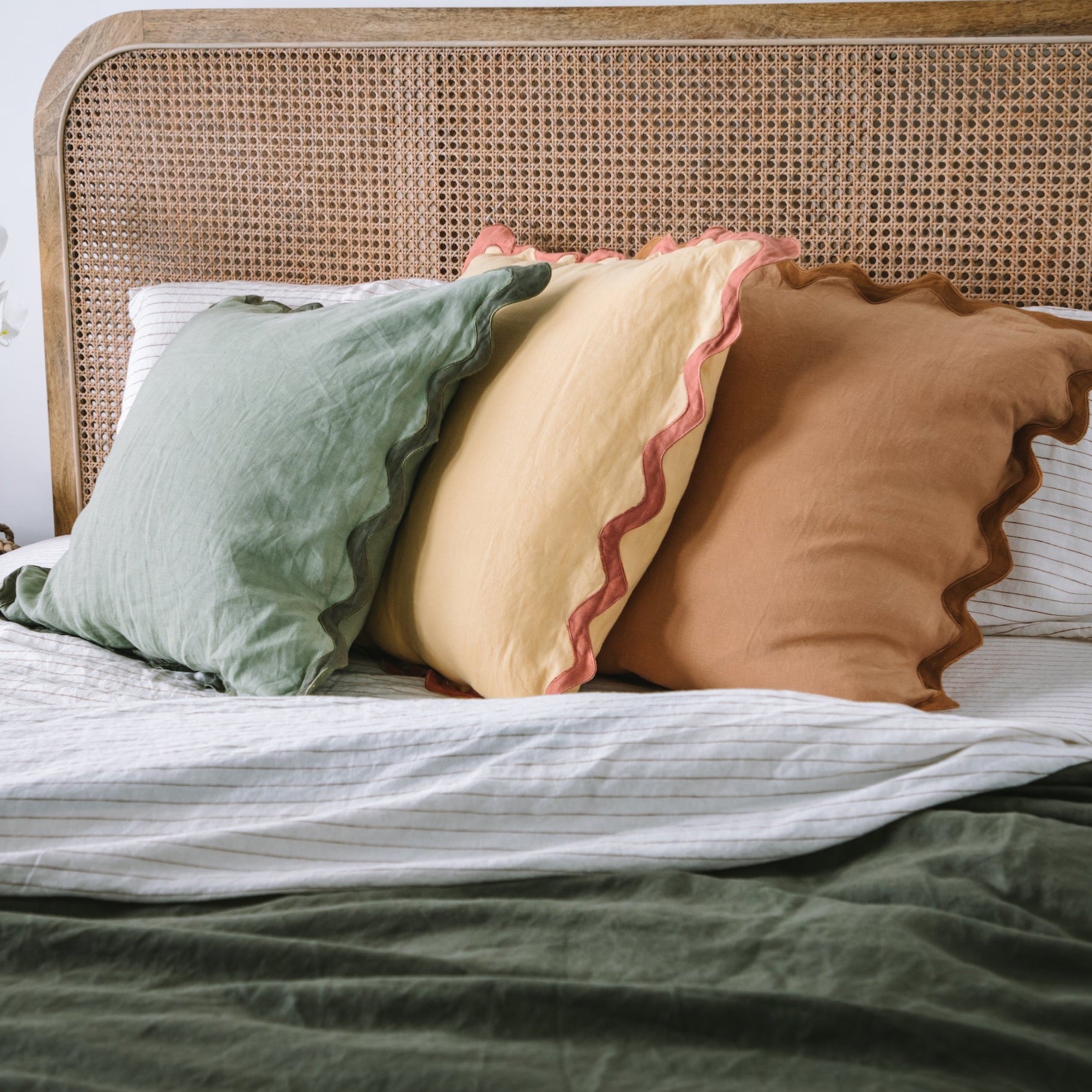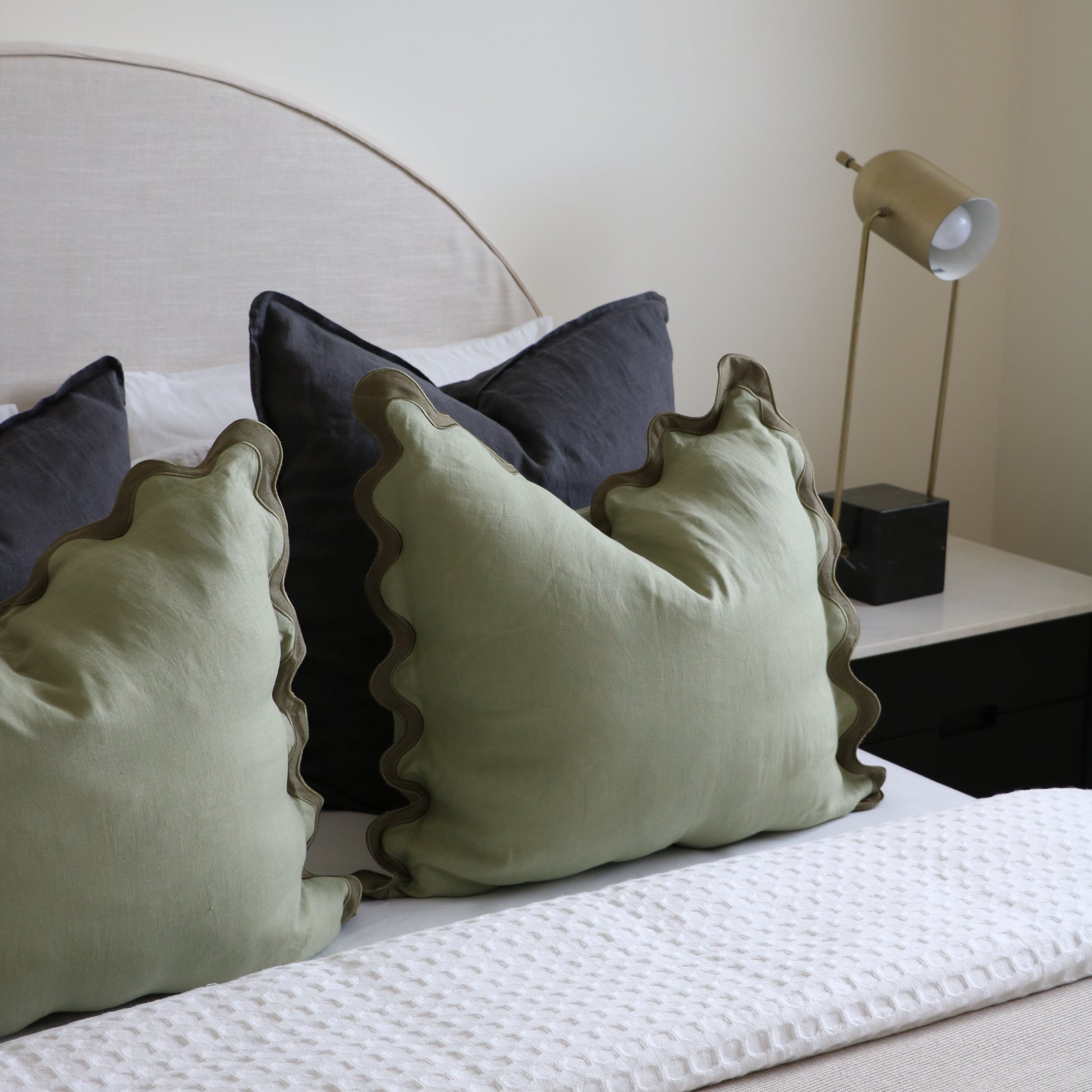 Our most popular style, the olive green scallop cushion is right on trend this season. Styled with the olive green sheet set, it provides the luxe feel and texture that a soft green brings to a room. We find it works perfectly when styled with our white fringe cushion, natural fringe cushion and our black and white striped cushion. For bedding, it complements the dusty pink duvet cover and sandstone sheet set. It can also be used as a feature piece, pairing it with a plain white sheet set and duvet cover. If you wanted a more dramatic look, we think it looks great with the burnt orange and yellow wave cushions.