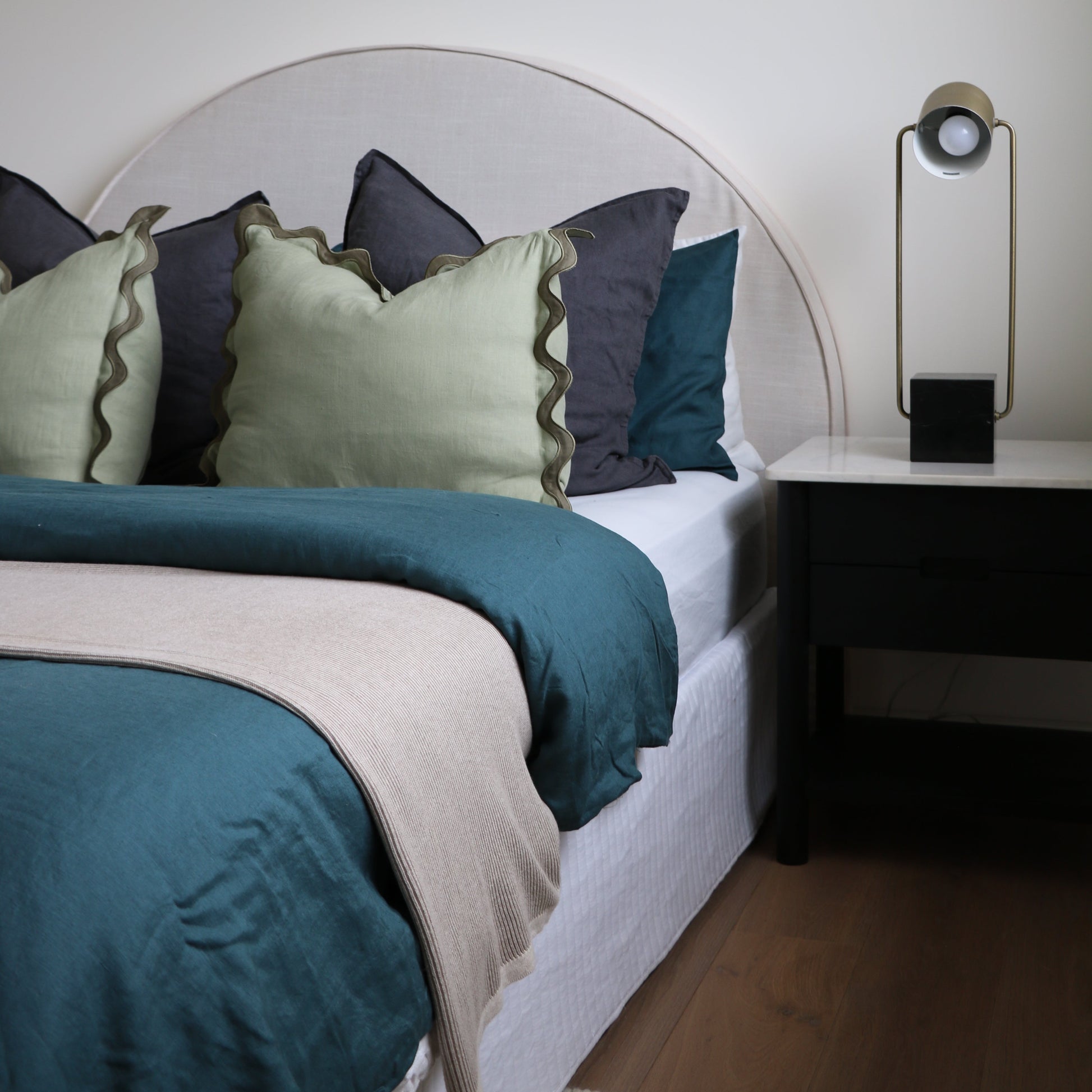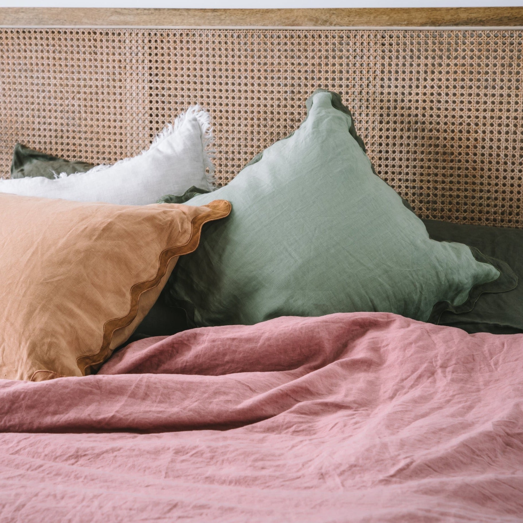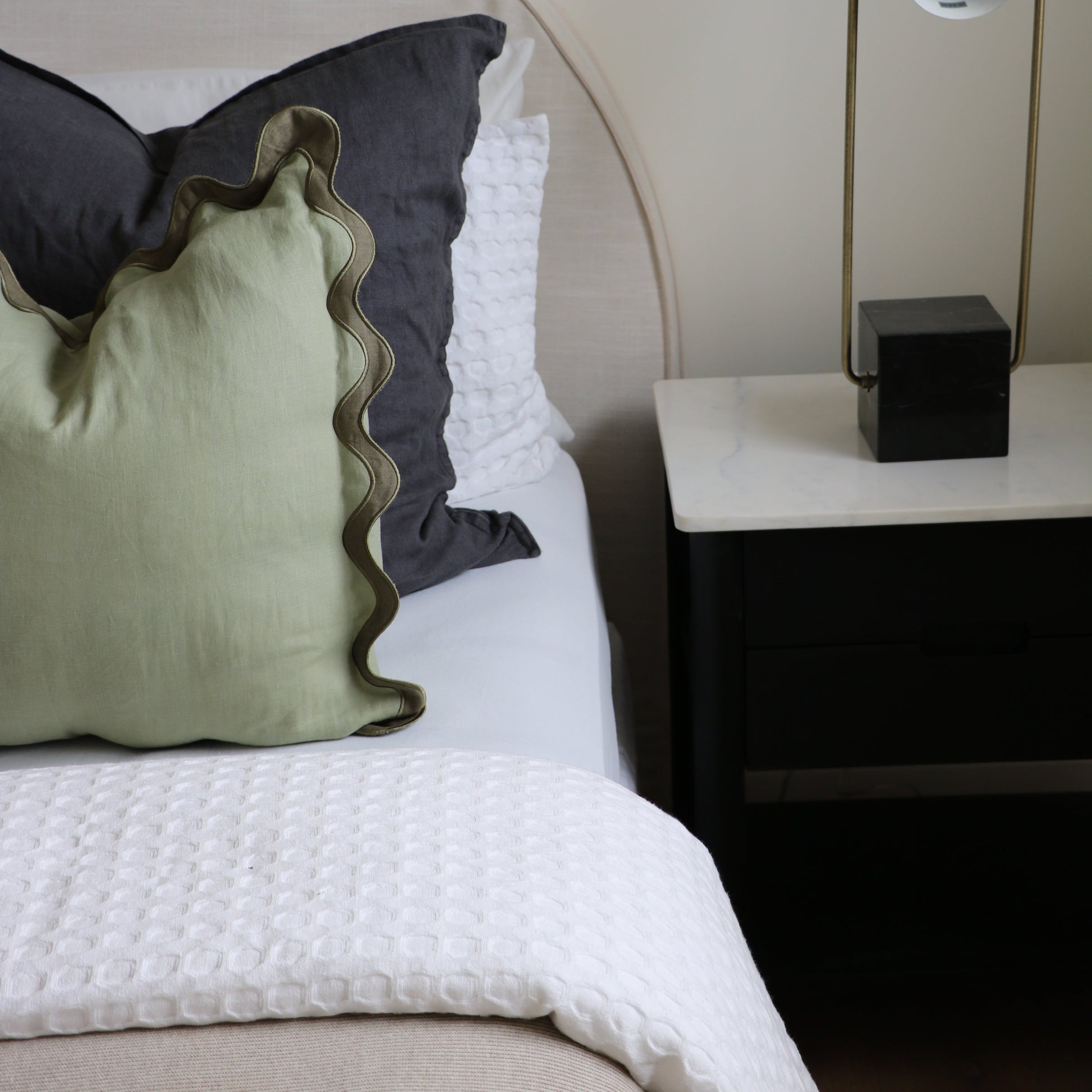 Our most popular style, the olive green scallop cushion is right on trend this season. Styled with the olive green sheet set, it provides the luxe feel and texture that a soft green brings to a room. We find it works perfectly when styled with our white fringe cushion, natural fringe cushion and our black and white striped cushion. For bedding, it complements the dusty pink duvet cover and sandstone sheet set. It can also be used as a feature piece, pairing it with a plain white sheet set and duvet cover. If you wanted a more dramatic look, we think it looks great with the burnt orange and yellow wave cushions.