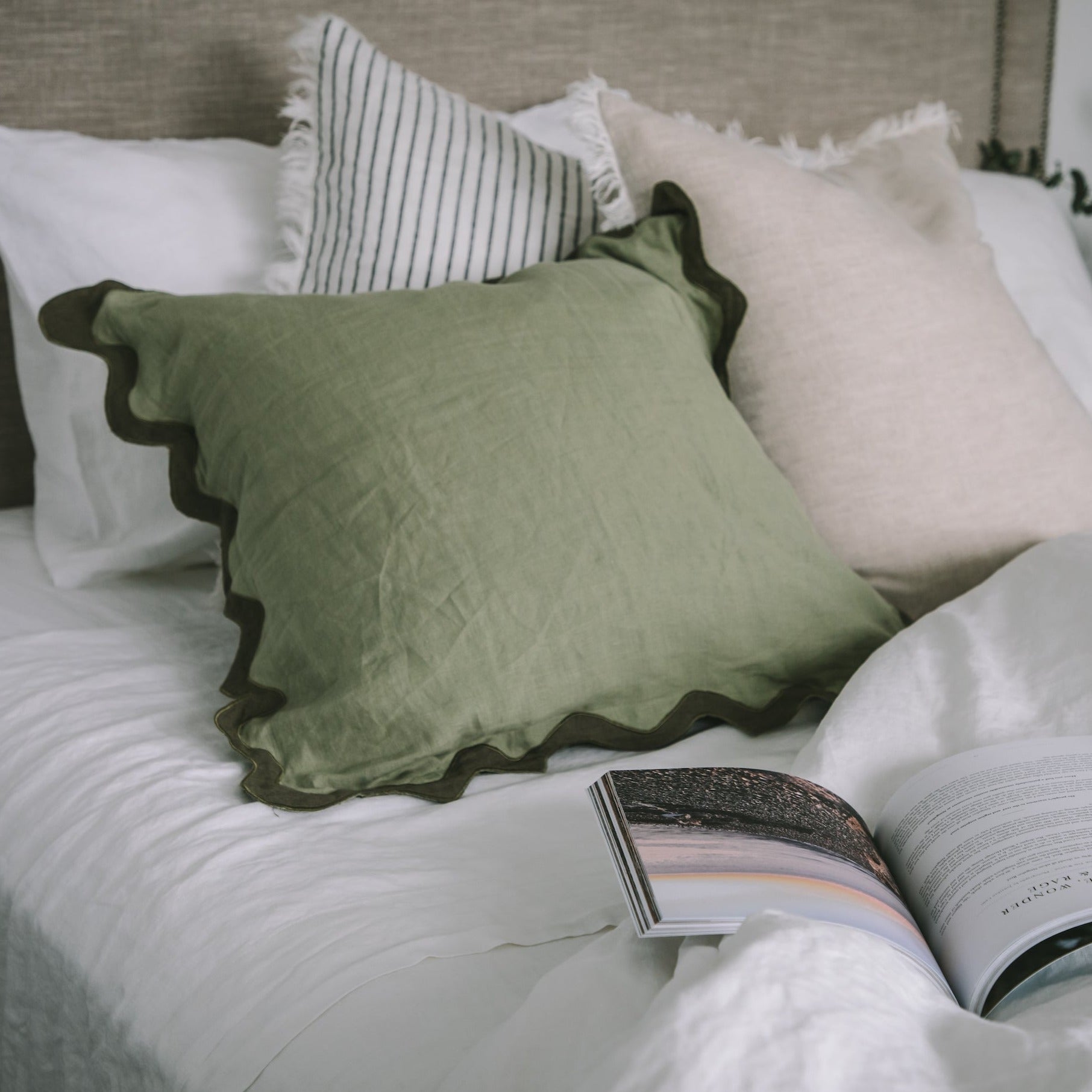 Elevate your interior style with our olive green cushion cover made of 100% European flax linen. It features a delicate scallop edging for added elegance and texture. The cushion has an olive green base with a dark green edging, and is our most popular cushion style.