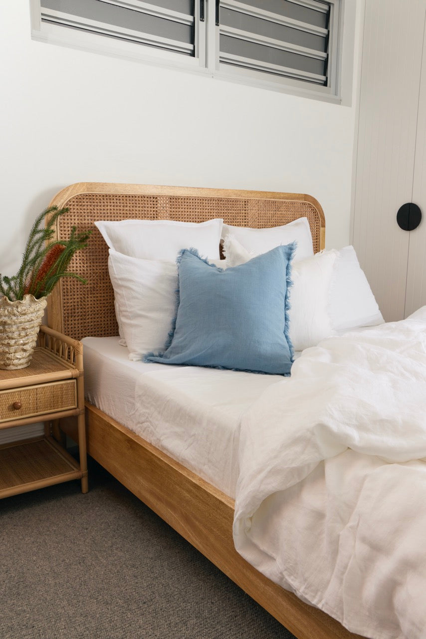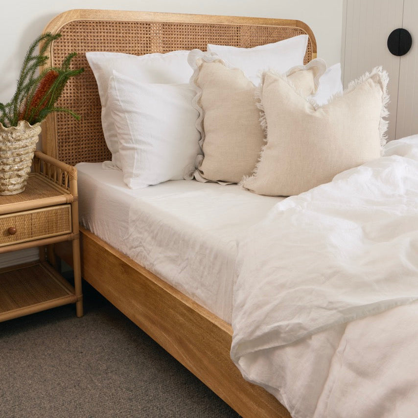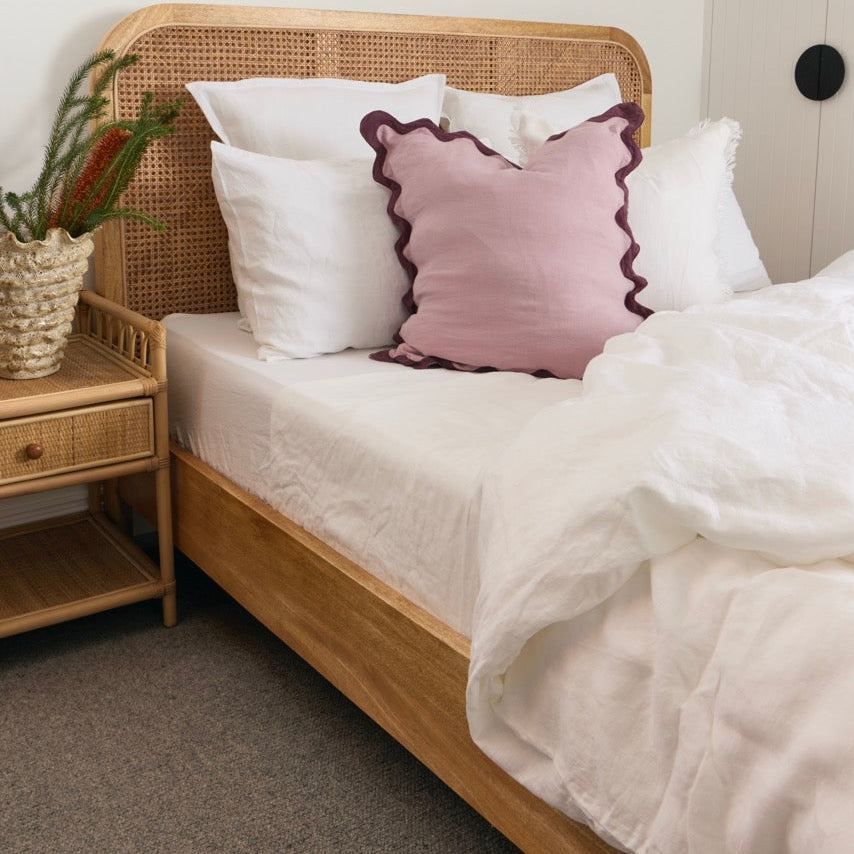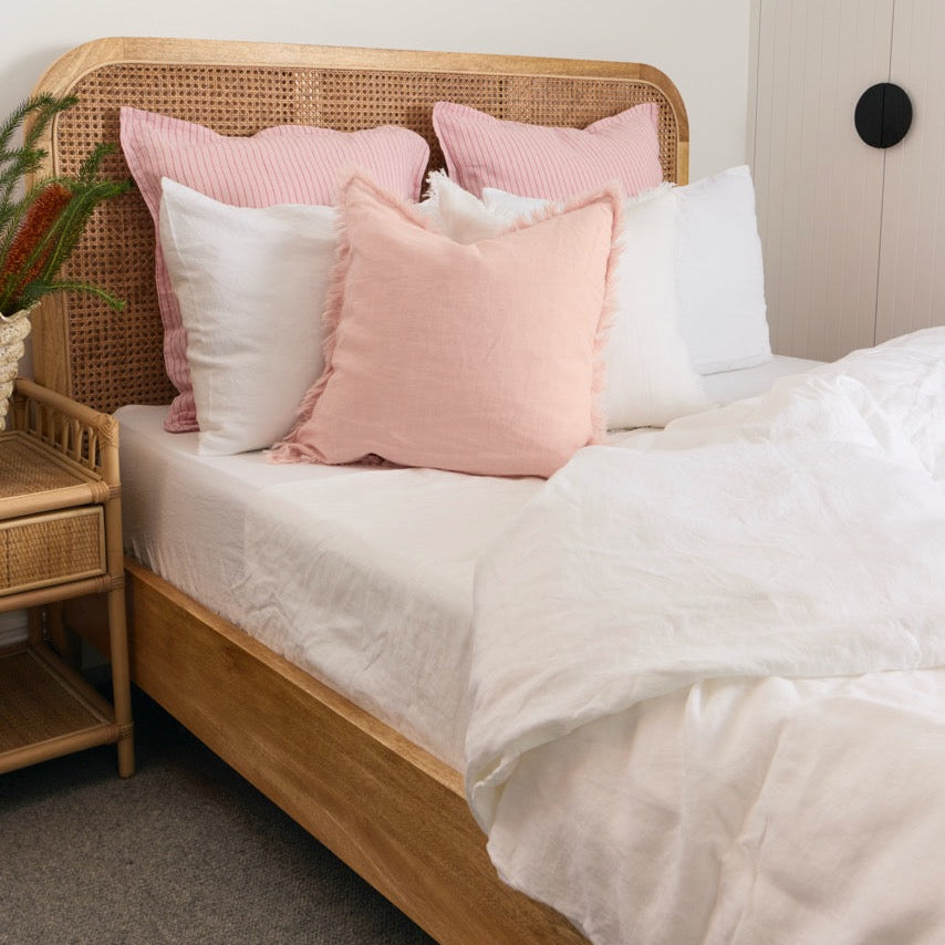 Pair our white French linen bed sheets with the Lurline Co. Blush wave & coastal stripe linen cushion and white linen duvet cover.
