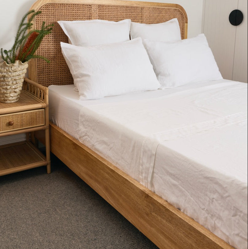 Pair our white sheets with the Lurline Co. Blush wave & coastal stripe linen cushion and white linen duvet cover.