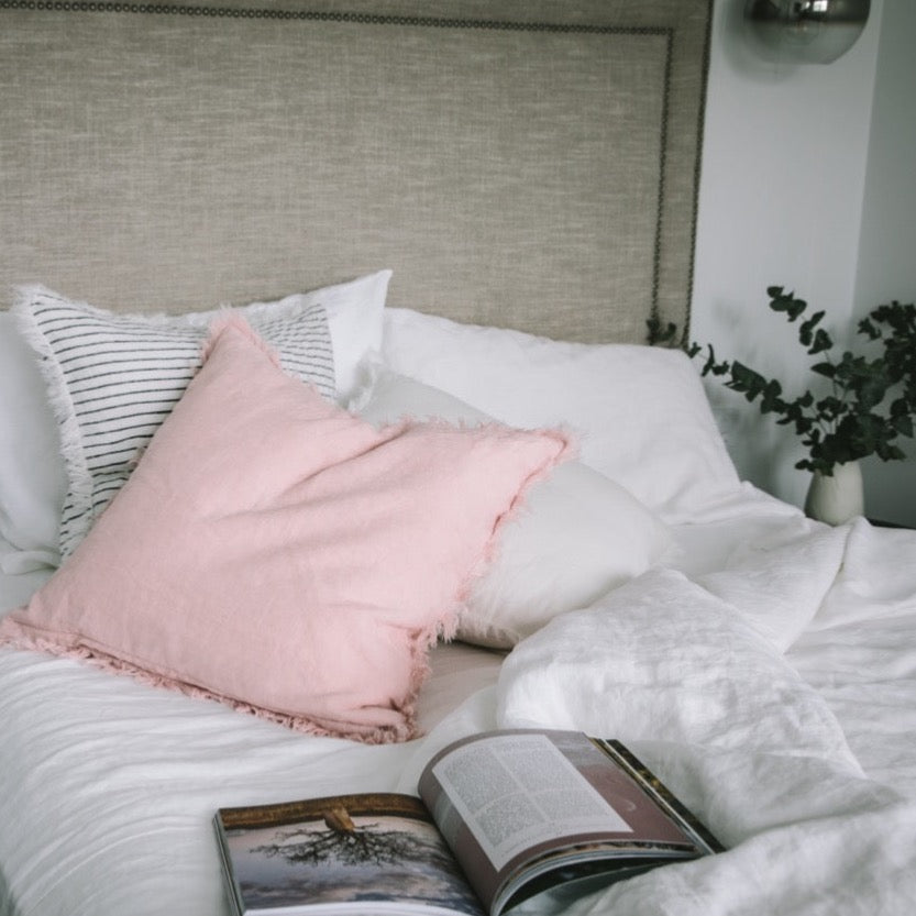 Similarly, we have paired it with our bed linen range in olive green, sandstone stripe, blush pink and white. It is a great layering piece to add volume and depth to your bedroom styling.